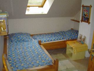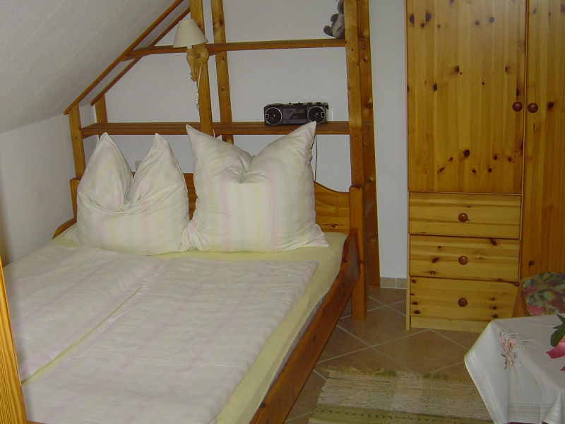 Das Doppelbett im großen Schlafzimmer hat die Ausmaße 2,00m x 2,00m. Das Bett im kleinen Schlafzimmer ist 1,40 x 2,00m groß und steht an der Wand. Das Übereck-Bett im Kinderzimmer ist an einer Seite 2,00 m und an der anderen Seite 2,40 m lang und 0,85m und 0,80m breit. Hier kann auch ganz bequem ein Erwachsener schlafen. |